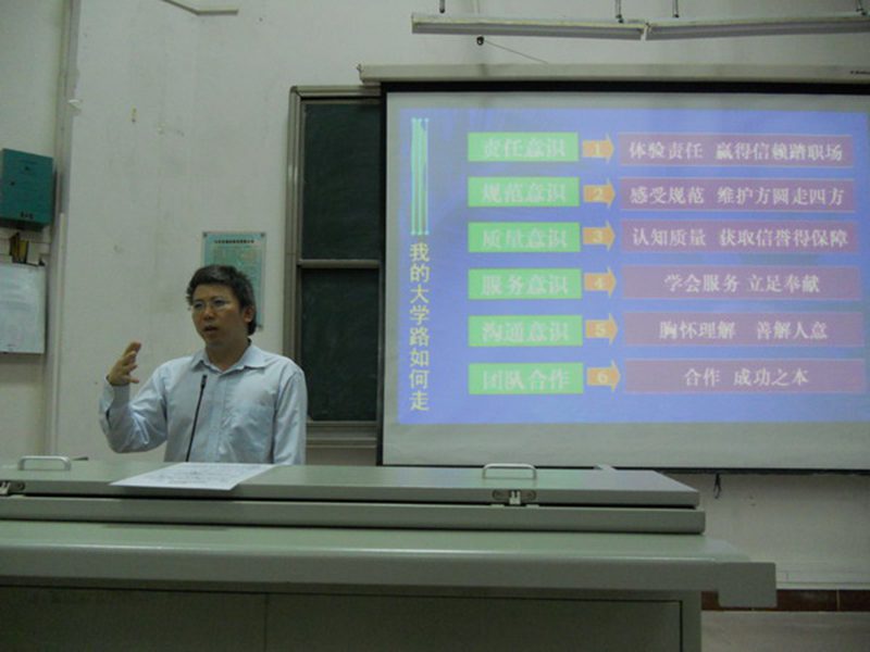 邱处长从大学生角色定位讲起,巧妙地运用人椅游戏向新生们展示了协调合作及团队精神的重要性,广大同学踊跃参与,讲座的气氛逐渐活跃起来。邱处长指出新生们应从责任意识、规范意识、质量意识、服务意识、沟通意识及团队合作方面着手培养良好的职业意识,并强调大学生应从会做人、会做事、会学习、提高学习办事效率、与人为善、善于沟通等几方面努力完善自己,为未来发展打下良好基础。