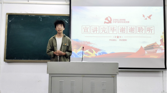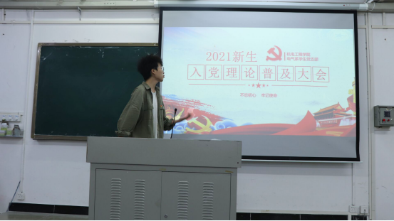 最后,青年委员廖伟杰鼓励新生积极主动地学习党史和党的基本理论,号召他们以自己的实际行动主动向党靠拢,并代表电气系学生党支部向新生们提出学习及生活上的相关建议,期待他们能够保持初心,不负韶华,努力前行。