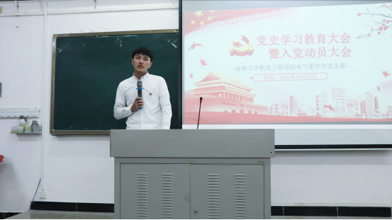 随后,电气系学生党支部组织委员傅青达从“外敌入侵,应对失策”、“模样示范,新生力量”及“中国共产党的诞生”三个方面讲述了中国由积贫积弱走向繁荣复兴的过程,绘出一段波澜壮阔而又艰难曲折的奋斗历程,昭示了中国共产党“为中国人民谋幸福,为中华民族谋复兴”的初心与使命。接着他又为新生介绍了入党的相关流程与注意事项,并阐述了党对人民、社会及国家的重要意义。