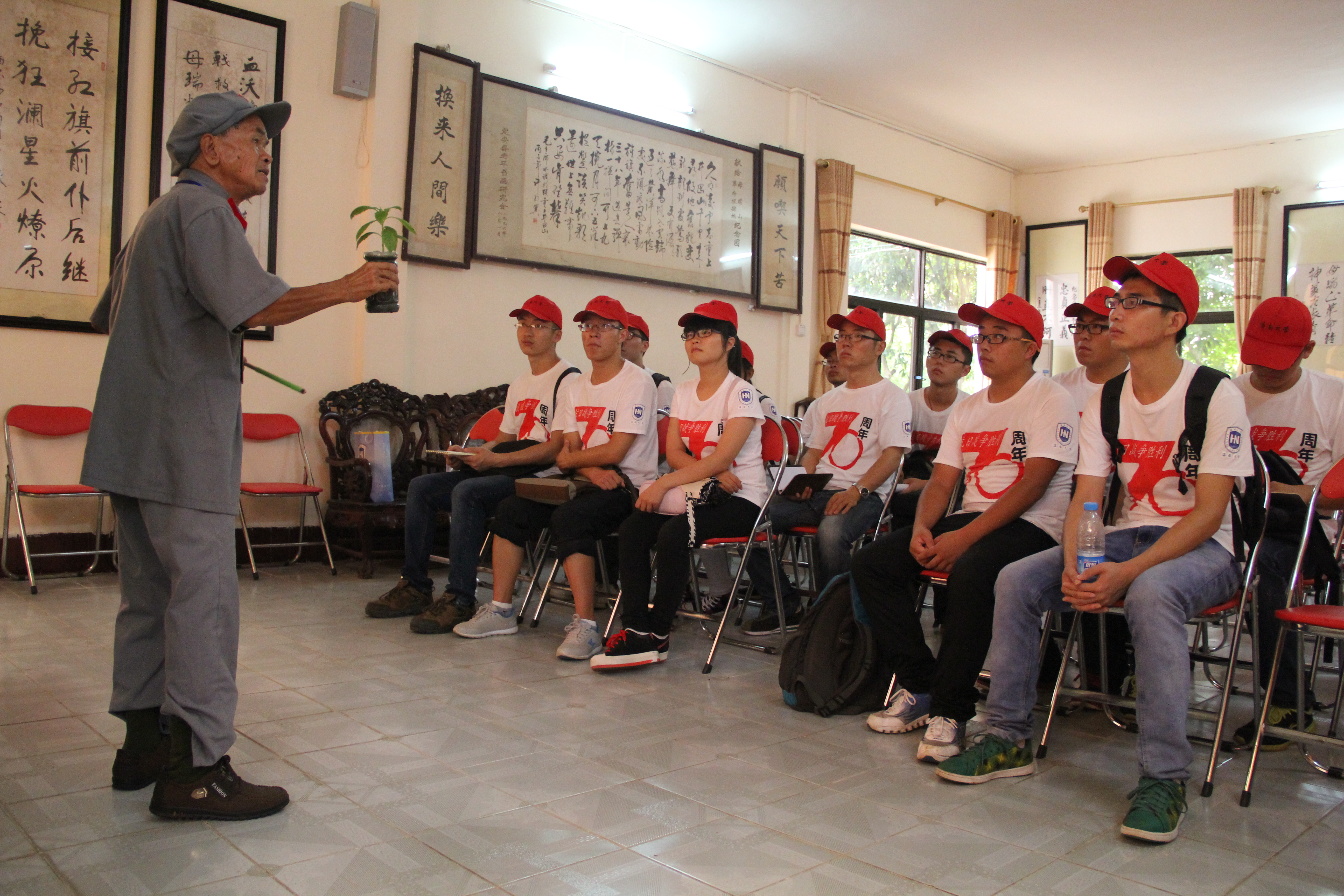 “母瑞山革命根据地纪念园”建在国营中瑞农场原红军操场的一座小山岗上,占地9亩。3.5米高的王文明主席、冯白驹将军铜像耸立在纪念园中央;两层楼的展览馆陈列了海南在新民主主义革命时期,以母瑞山革命根据地为中心的革命斗争史料。寻访团一行人在对纪念园做了认真调研记录后,跟随着王学广老先生来到了纪念园讲解室。王老先生是纪念园的园长,他身穿朴素的红军装,极为生动地为寻访团讲述了母瑞山革命历史。当讲述到先烈英雄的艰苦奋斗时,在场所有同学为之震撼,母瑞山保存了两次革命的火种,为海南革命燃起希望。在讲解结束之际,王老先生为一行人总结了母瑞山革命精神,可概括为32个字:崇高理想,坚定信念;不怕牺牲,勇于献身;相信群众,依靠群众;自力更生,艰苦奋斗。王老先生最后提到:“母瑞山是革命的山,英雄的山,母瑞山革命之火代代相传!母瑞山革命精神,光辉千秋!”
