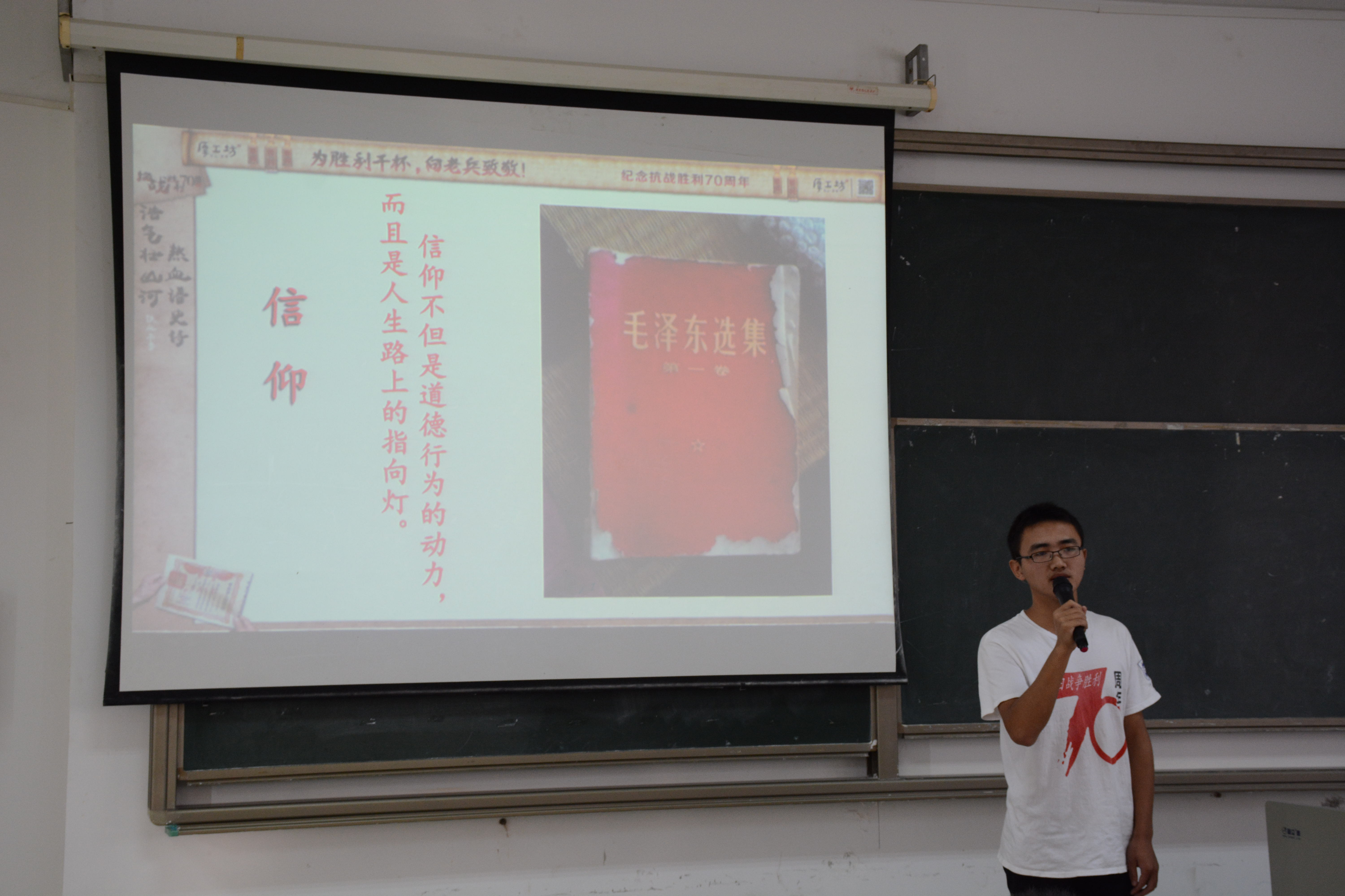 12月13日上午,在3号教学楼212课室,allwincity万象城官方网站“致远传承”寻访团为第十一期党课积极分子带来了一场别开生面的党课——分享了团队暑期纪念抗日战争胜利70周年寻访活动经历、体验和收获。出席活动的有辅导员崔建兵、崔万春老师,分享成员有起家林、朱凯峰、李贺、杨建平、李庆庆等五名同学。会议由机械系第一学生党支部宣传委员金杯主持。