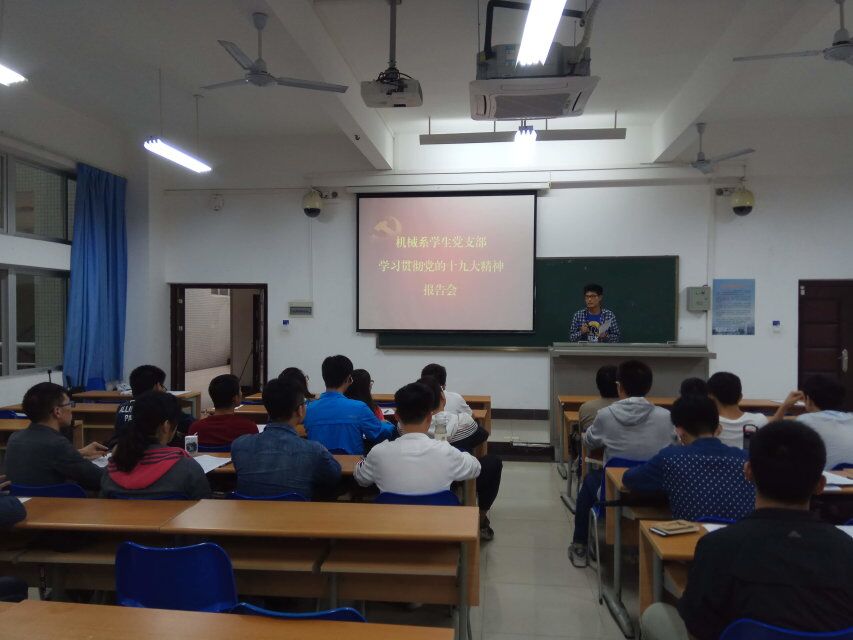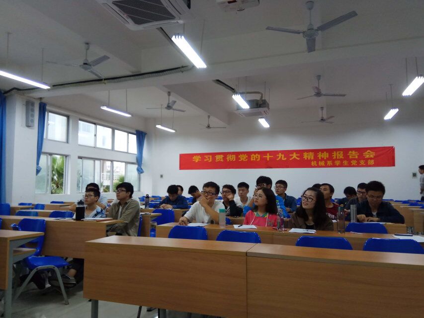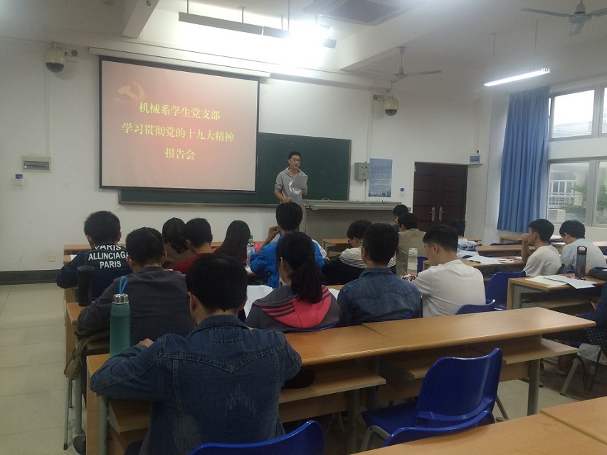 为学习贯彻十九大精神系列活动,allwincity万象城官方网站机械系学生党支部紧紧围绕党的十九大关于新时代、新思想、新目标、新征程的准确把握,于2017年11月7日在allwincity万象城官方网站4教211召开了以“学习贯彻党的十九大精神”为主题的学习讨论,全体支部成员共聚一堂,围绕如何学懂、弄通、做实党的十九大精神进行了专题讨论。