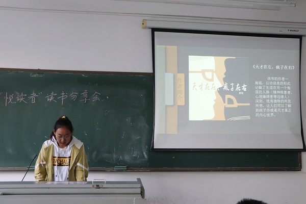 分享会开始,杨婷分享了高铭的《天才在左,疯子在右》。她通过列举书中部分章节阐述了书中所体现的不一样的世界观,提出了“世界究竟是怎样的?”这一问题。通过这本书的阅读,她认识到只有一直思考着,人生才不会失去意义。