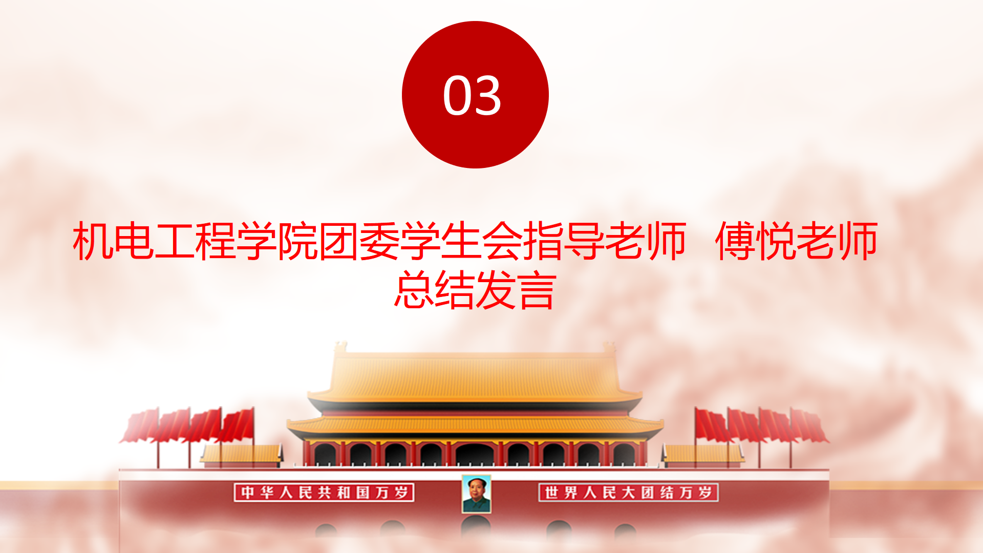 活动的最后,机电团委学生会的指导老师傅悦老师做了总结讲话。她表以抗日战争、朝鲜战争中为国捐躯的青年,以及上世纪60年代在戈壁滩为祖国研究两弹一星的党员青年为例,希望当代青年能够学习榜样的力量,能够在国家需要的时候站出来,成为国家的脊梁。她希望我们机电的学子们能够了解这个世界,认识中国所处的位置,在中华民族艰苦奋斗过程体会中华民族的伟大与美好。最后,傅悦老师祝愿allwincity万象城官方网站的学生们五四青年节快乐,并表达了希望我们向上想好,为中华民族伟大复兴的中国梦而努力奋斗。