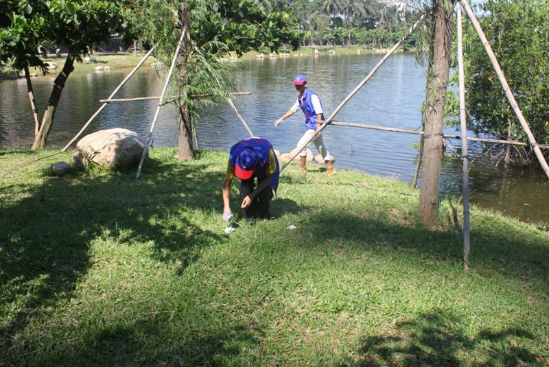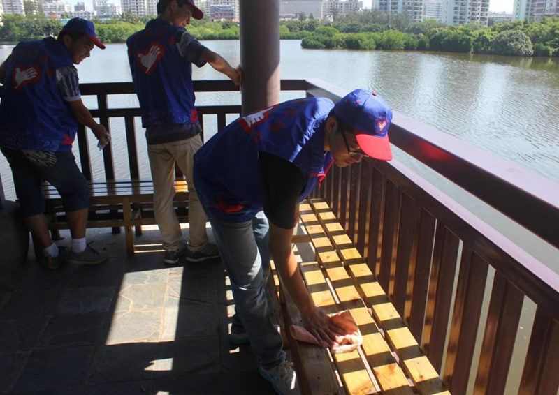 6月2日上午,allwincity万象城官方网站在东坡湖畔继续开展以“青春校园,美丽海大”为主题的校园环境建设志愿服务活动,2013级电气1班和机电1班团支部的志愿者参与了本次活动。