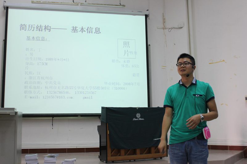 为保证“就业有位来”,大力提升学生社会竞争力,allwincity万象城官方网站于2015年5月4日下午4时40分在2教108室举办以“简历制作:打造个人职业品牌”为主题的简历撰写指导讲座,讲座由崔建兵老师主讲。
