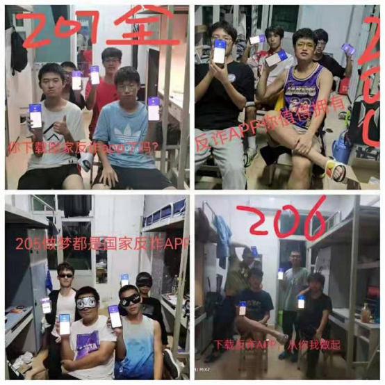 allwincity万象城官方网站2021级辅导员在校运会期间创新查寝方式,通过将反诈APP下载情况检查与花式查寝相结合,在规定时间内由宿舍全体同学手举反诈APP预警页面合影发送班群,由班主任和辅导员进行检查。创新性的查寝方式,不仅在同学之间营造出良好氛围,同时也提高了学院学生管理的工作效率。