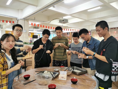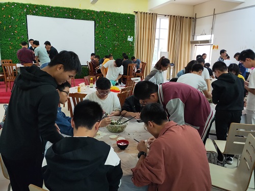 上午九点,年级组委会开始采购,事先购买肉馅以及各种配料,采购完成后将物资统一配发给各班班委。在包饺子的活动中,有人因为第一次包饺子,动作生疏,费好大劲才能包出一个完整的饺子,有人经常帮家里包饺子,动作娴熟,包出的饺子也完整好看。最后大家把包的饺子都放入锅中,饺子的热气,陈醋的香气,冬至的喜气充斥在六食堂的三楼,呈现出其乐融融的氛围。