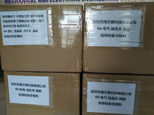 母校庆生比海深,复学防疫兴大业。在疫情防控正处于关键时期,各地校友纷纷伸出援助之手,通过各种方式和渠道,向母校捐赠疫情防控物质,为母校师生复学复课提供了有力支持和重要保障。江浙沪校友会共捐赠口罩8000只;1996级电气校友陈先念、陆永昌、1999机电但红伟代表深圳市鑫尔泰科技有限公司捐赠6000口罩;2004级农机校友蔡振得、蔡大平捐赠2000只口罩;2008级机电校友李宗红捐赠3MFFP2口罩2000个。我们坚信,在学院领导的坚强领导下,在广大校友的鼎力支持下,万众一心、众志成城,我们一定能打赢这场疫情防控阻击战。