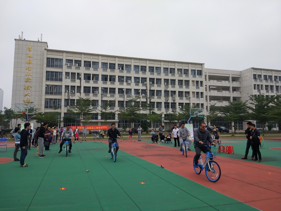 在老师们到场后,比赛正式拉开帷幕。老师们热情高涨,跃跃欲试,无论是慢骑自行车时的稳重、踩气球时的活跃、跳绳时的洒脱,还是团体赛时的默契,这些无不向我们展示着机电老师们的朝气蓬勃!在慢行的比赛项目中,各位参赛老师用尽浑身解数,排除其他老师的故意干扰,在保持身体平稳的前提下抵达终点,同学们的加油欢呼,老师的稳中向前,表现出比赛的趣味。踩气球赛时更是全体动员,老师与同学们使用了不少“战略”,比如声东击西,攻其不备,联手作战等。尤其是幼儿组,不少偷袭的行为更是令众人捧腹大笑。团体赛项目中,老师们团结一心、紧密配合,无论是“同舟共济”向前走时的同步一心,还是传递呼啦圈的紧张有趣、众志成城,都充分发扬了老师们团结协作的精神,赛场上所有成员齐心协力,欢呼声、欢笑声,此起彼伏。尽管天公不作美,中途天上飘着蒙蒙细雨,但比赛的喜悦早已将它忘去。