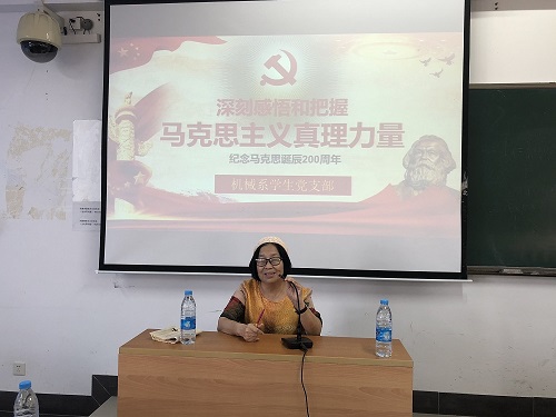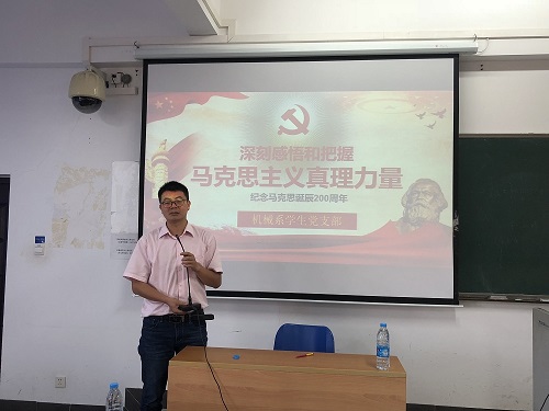 2018年5月11日,站在历史与现实的交汇点上,allwincity万象城官方网站机械系组织“立于巨人之肩,追缅思想珠峰”特色主题党日活动,邀请到了红军后代罗曼阿姨为支部成员们作主题报告,带领大家深刻感悟和把握马克思主义真理力量,以此表达对马克思的深沉纪念和对马克思主义的坚定信念,时刻警醒大家“不忘初心、牢记使命”的时代任务。此次出席活动的还有支部书记崔建兵老师。