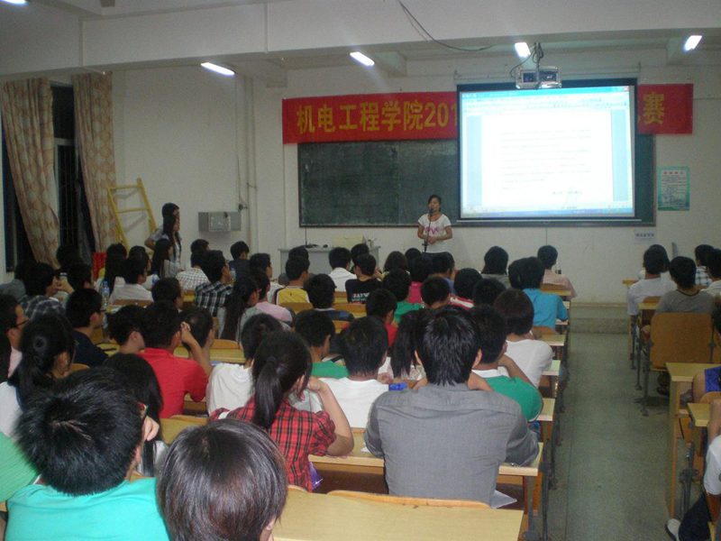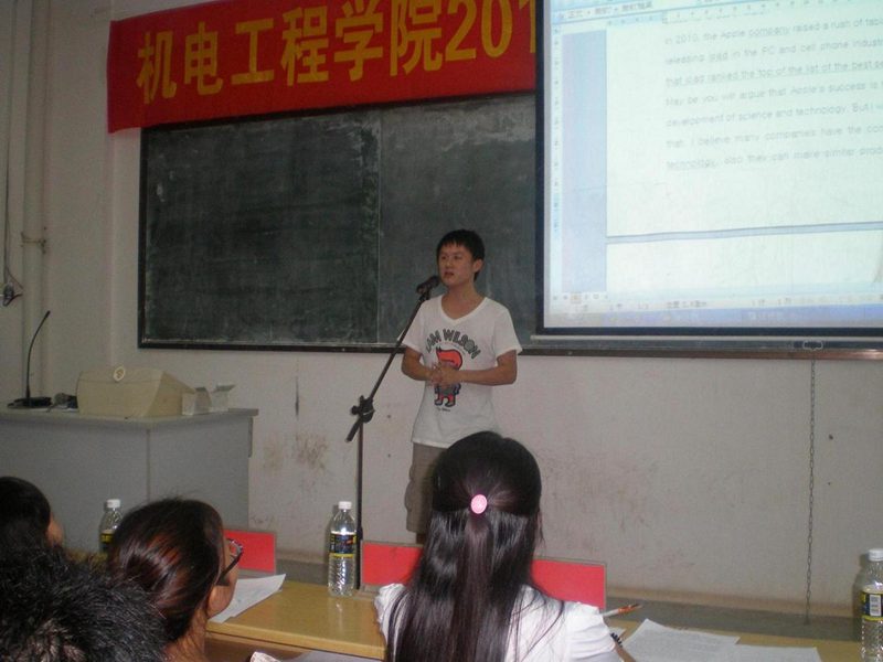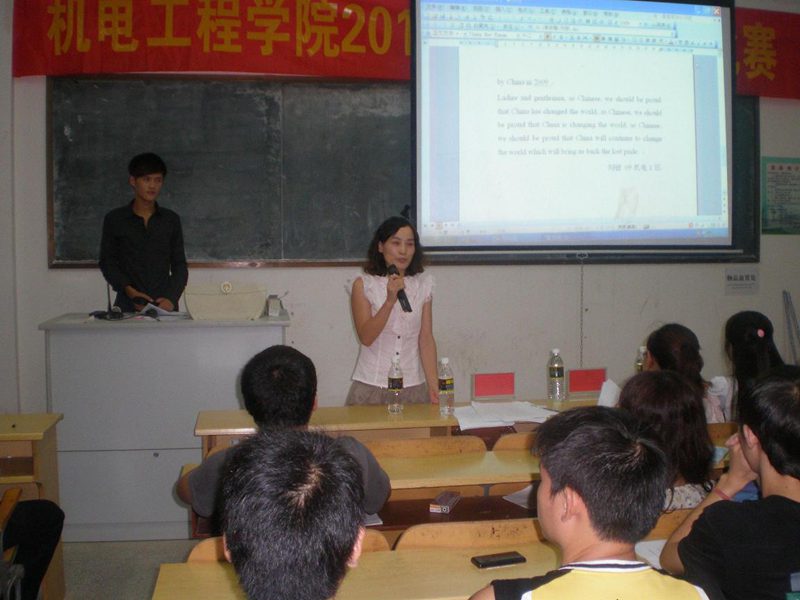 为了迎接2011年“外研社杯”全国英语演讲比赛,万象城官网在9月8日(星期四)在3302课室举行院内选拔。出席此次英语演讲比赛的嘉宾有崔建兵、姚广龙老师,担当评委的有应用科技学院英语老师王菲、金晓霞,以及全国大学生英语竞赛(NECCS)获奖者马鑫。此次演讲的题目是:A Word That Has Changed the World。比赛选手由各班级推荐,共15名参赛选手,到场观众有近160名。