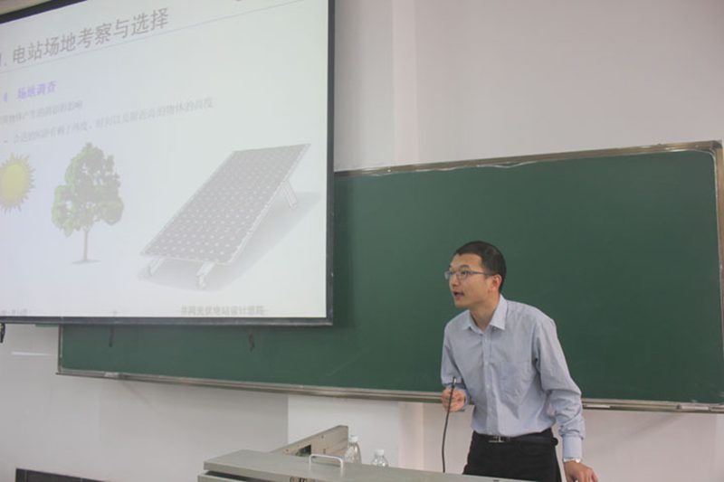 在为期2天的授课中,孙博士全面系统地讲授了以“光伏电站设计、建设与运行维护”为主题的课程,主要对象是2012级电气工程及其自动化本科专业的学生,部分教师和研究生也聆听了讲座。作为在光伏电站方面拥有十余年设计、管理经验的专家,孙博士主要从“并网光伏电站设计思路”、“光伏电站构成及器件选型”、“光伏电站故障分析与运维管理”和“并网光伏电站全生命周期收益保障”四个方面向同学们进行了讲解。授课过程中,孙博士结合自己丰富的工程设计与管理经验,用幽默的语言与真挚的情感深深感染了同学,精彩的授课赢得了在座师生们的阵阵掌声。