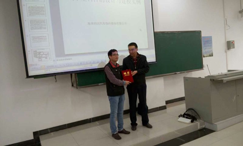 2014年1月15日,海南钧达汽车饰件股份有限公司副总经理、高级工程师陈家涛应邀来万象城官网对2012级车辆工程、交通运输专业进行冬季小学期授课,唐荣年副院长主持了开课仪式,并为陈家涛副总颁发了冬季小学期授课专家聘任证书,汽车系主任李劲松副教授等教师也参加了讲座。