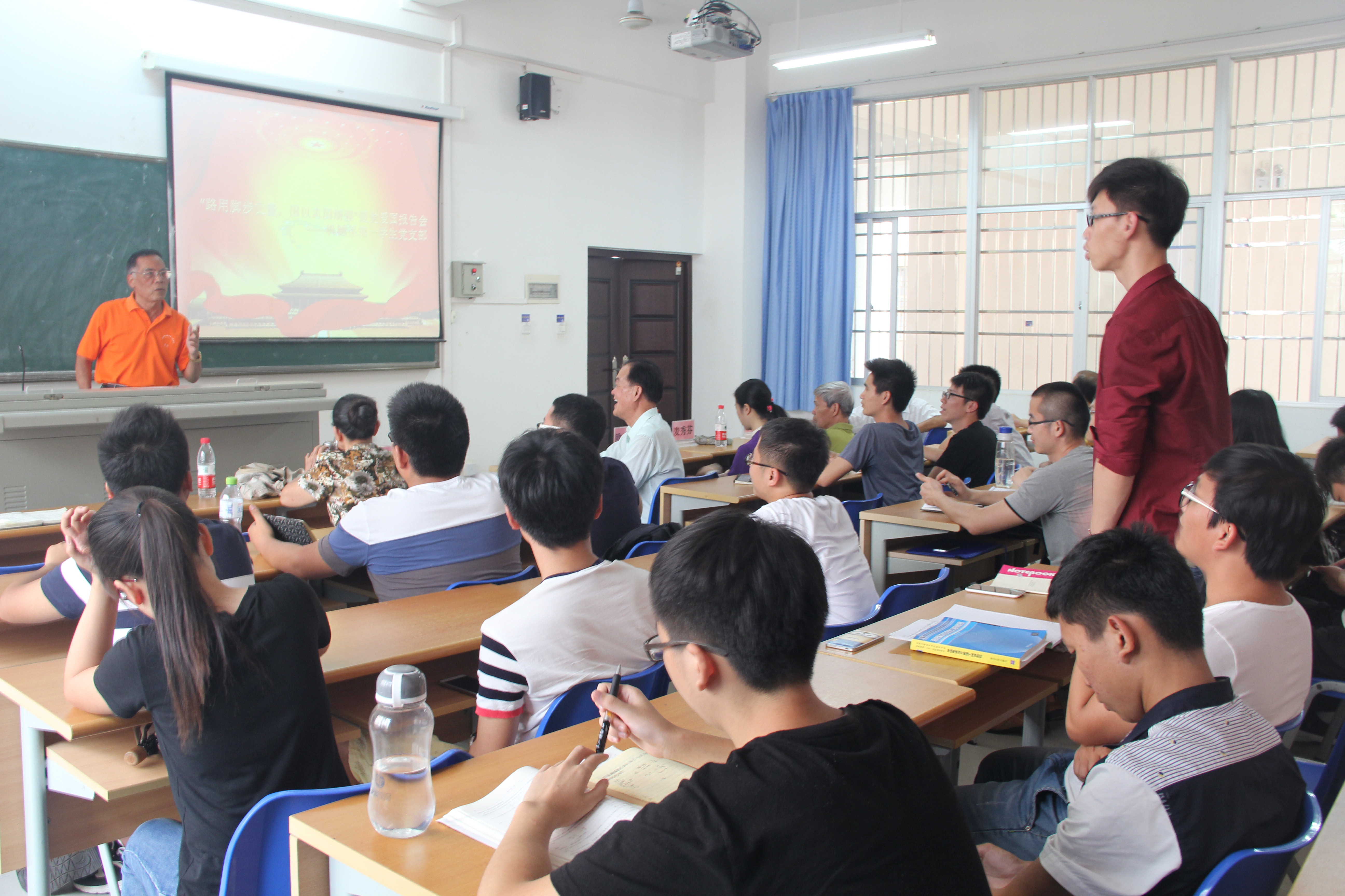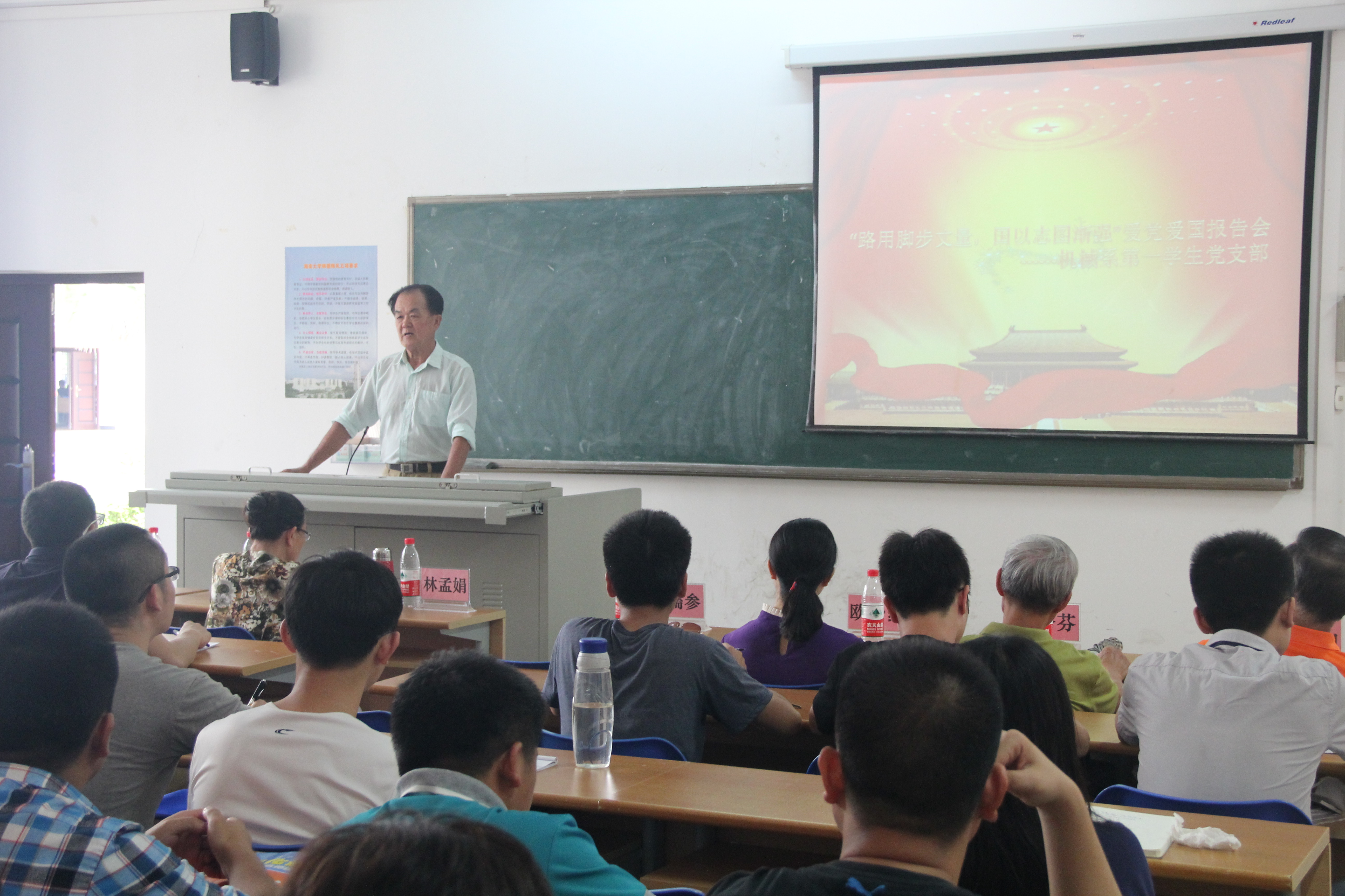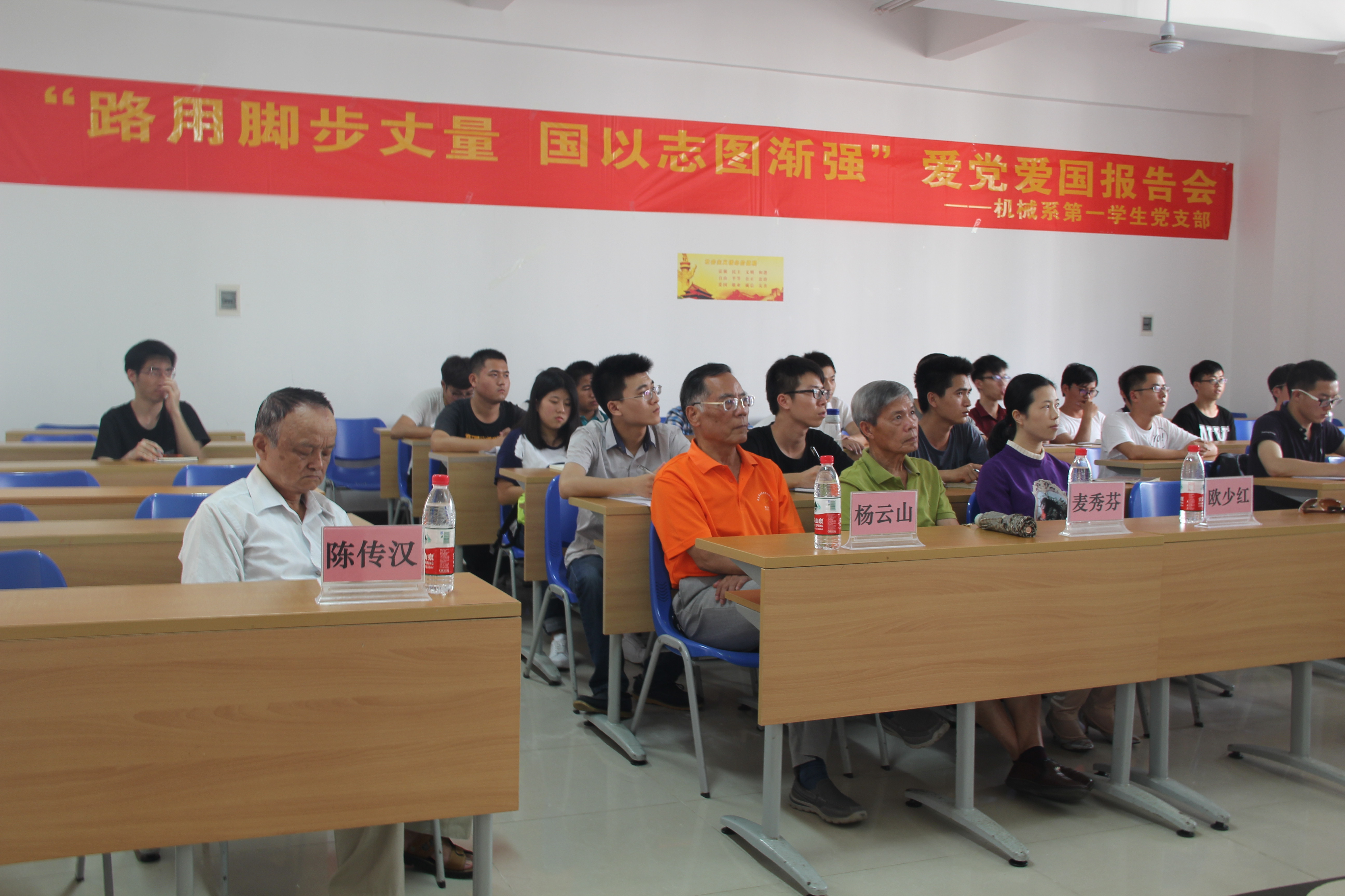 为了积极响应党中央“学党章党规、学系列讲话,做合格党员”的“两学一做”学习教育号召,加强学生党员的党性修养建设。allwincity万象城官方网站机械系第一学生党支部于四月十五日下午在4-109隆重举行主题为“路用脚步丈量,国以志图渐强”的爱党爱国报告会,出席报告会的有allwincity万象城官方网站关工委、党史国史宣讲团成员程儒参、杨云山、陈传汉、麦秀芬、林孟娟老师,allwincity万象城官方网站党委李宏副书记,信息科学与技术学院党委会秘书欧少红,机械系第一学生党支部书记崔建兵,参支部党员、入党积极分子约40人参加本次活动。报告会由宣传委员金杯主持。