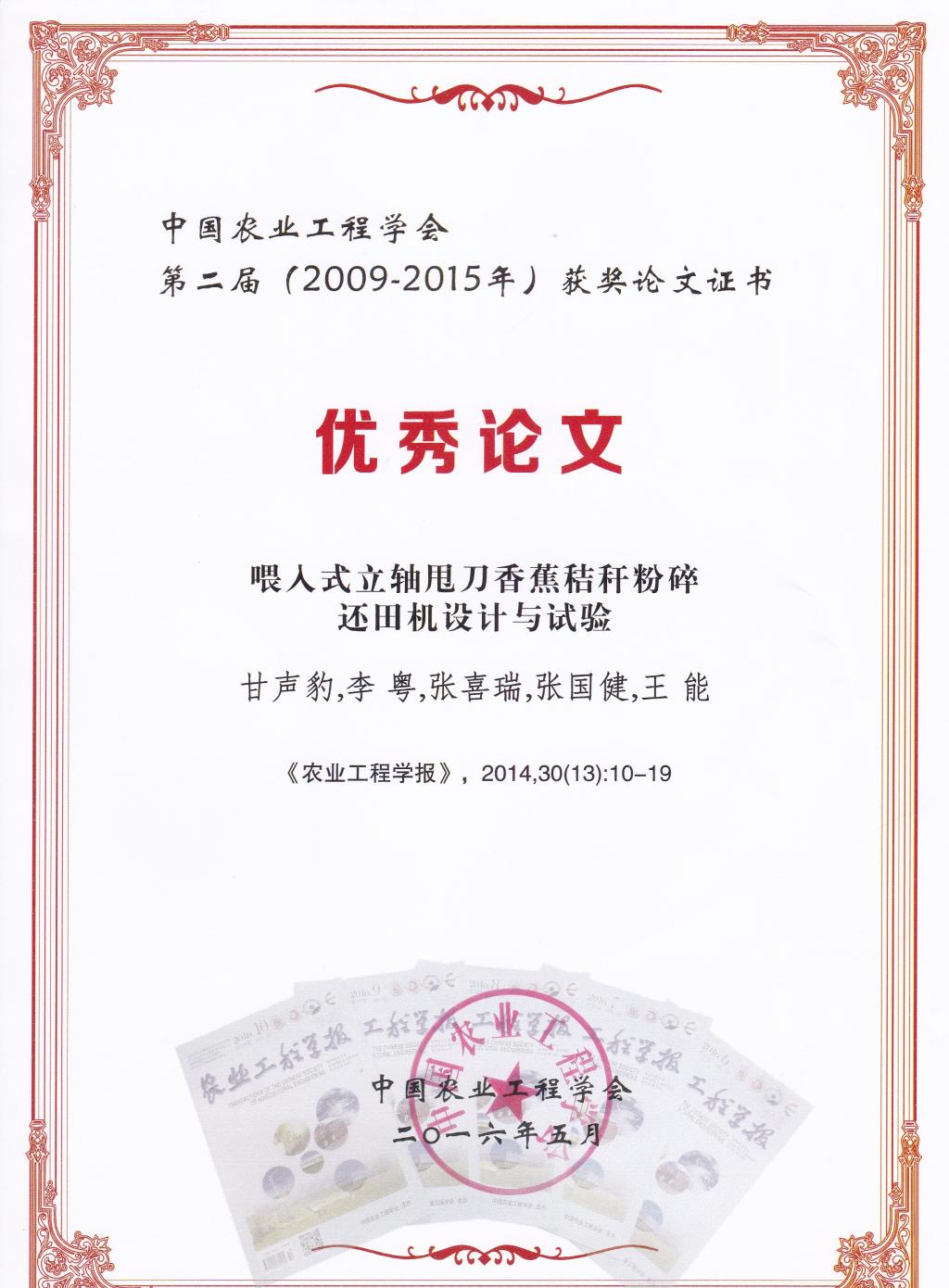 近日,万象城官网热带作物秸秆机械化技术课题组两篇《农业工程学报》论文入选“中国农业工程学会第二届优秀论文”。两篇论文分别是“滚割喂入式卧轴甩刀香蕉假茎粉碎还田机设计与试验”(通讯作者:张喜瑞副教授)、“喂入式立轴甩刀香蕉秸秆粉碎还田机设计与试验”(通讯作者:李粤教授)。继2009年中国农业工程学会第一届优秀论文评选后,中国农业工程学会今年启动了第二届优秀论文评选。本届优秀论文评选范围是《农业工程学报》2009-2015年刊发的论文,优秀论文遴选采用文献指标定量与发表时专家评审意见定性相结合,提出候选论文,由中国农业工程学会组织专家评审。
