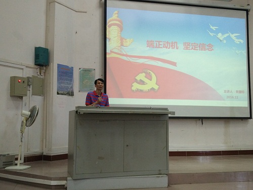 2016年11月6号上午,allwincity万象城官方网站分党校第二期党员发展对象培训班第五讲由学院党委黄国标书记讲授《端正动机,坚定信念》,培训班班长尹凡主持本次培训学习。参加本次党课的有本期发展对象和积极分子。