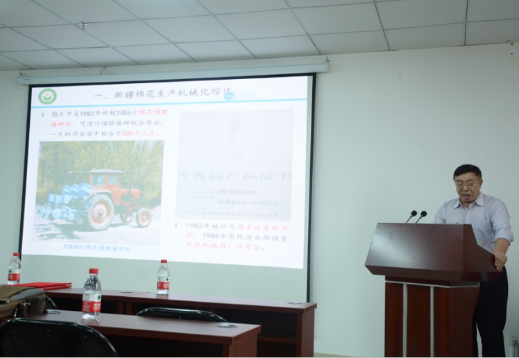 报告会上,陈学庚院士从“新疆棉花生产机械化装备”、“新疆棉花生产机械化技术体系创新”、“研究团队目前攻关目标”等几个方面,立足于自身及团队的科研经历,以贯穿于新疆地膜植棉产前、产中和产后的精量播种、膜下灌溉、喷药和施肥、棉花收获及地膜回收等过程的机械装备技术研发为主线,介绍了科研团队如何突破地膜植棉机械化关键技术、如何攻克滴灌技术大规模应用农机装备难题,分享了支撑新疆棉花产量两次飞跃的多项棉花生产机械化关键技术与农机装备研发成果,鲜活生动地阐述了院士科研团队的培育、建立与成长的过程。同时,他还强调,做科研必须紧密联系实际需求、实事求是、脚踏实地、能耐得住寂寞,只有坚持不懈、只有经历反复的尝试与失败才能研发出真正服务于生产、促进生产的技术与装备。