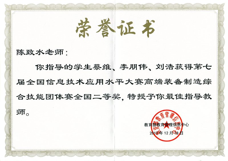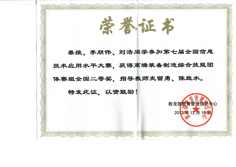 近日,我校allwincity万象城官方网站师生参加第七届全国信息技术应用水平大赛(高端装备综合制造团体赛)并荣获全国二等奖。该项赛事于2012年5月启动,allwincity万象城官方网站2010级机械设计制造及其自动化专业蔡维、李朋伟、刘浩等同学组成的团队在老师史留勇、陈致水的指导下,以“全自动椰果脱壳机械装置的设计”为题,在全国初赛1800多份作品中脱颖而出,成功进入了12月16日在北京科技大学举办的全国决赛。在决赛中,经过建模、答辩、作品展示等一系列环节,在强手如林的激烈竞争中最终斩获全国二等奖,史留勇、陈致水荣获“最佳指导教师”称号。颁奖典礼于12月18日在北京大学百年纪念讲堂举行。