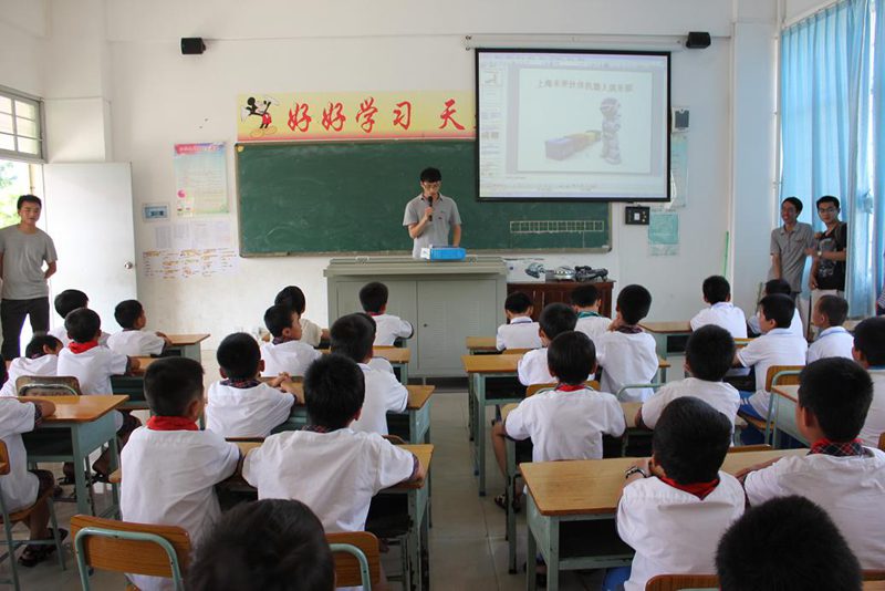在多媒体教室,首先科技服务团成员高建伟播放一些有关制作机器人的视频,并向小学生们宣讲实践动手的重要性。高建伟向同学们演示了机器人的拆装步骤,并着重强调了过程中的注意事项。同学们认真仔细地观察,并不断的记忆;接着,科技服务团成员将学生分为12组,每组由4到5名同学及科技服务团一名老师组成。随后,科技服务团老师把学生带到指定的场地,指导同学们自行拆装机器人,同学们不断尝试和改进,直到自己亲手组合成功。