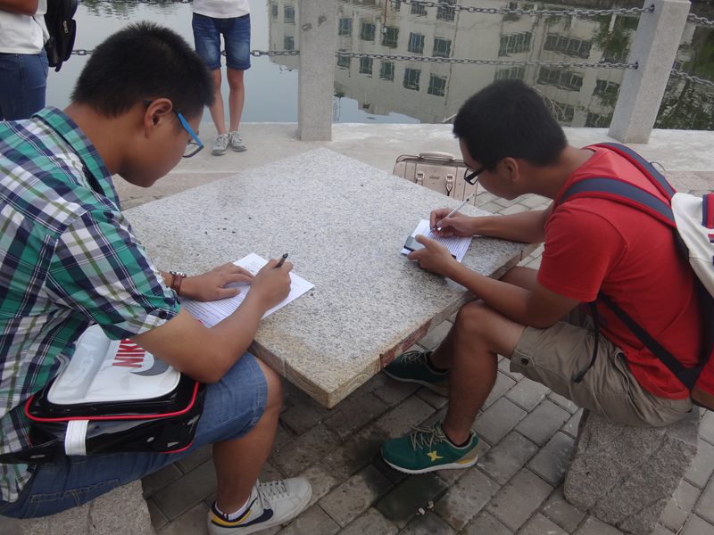 早上7:00晨读活动正式开始,同学们在领读老师的指导下通过手机微信平台以及纸质材料获取晨读信息。虽然是第一天晨读,但从到场的人数和在场的阅读氛围可以看出14级新生和老生十分积极并愿意参与英语晨读活动。领读老师不时地与现场同学提问互动,有的同学还拿出笔认真记下重点。晨读结束后依然有不少学生在东坡湖畔大声朗读。