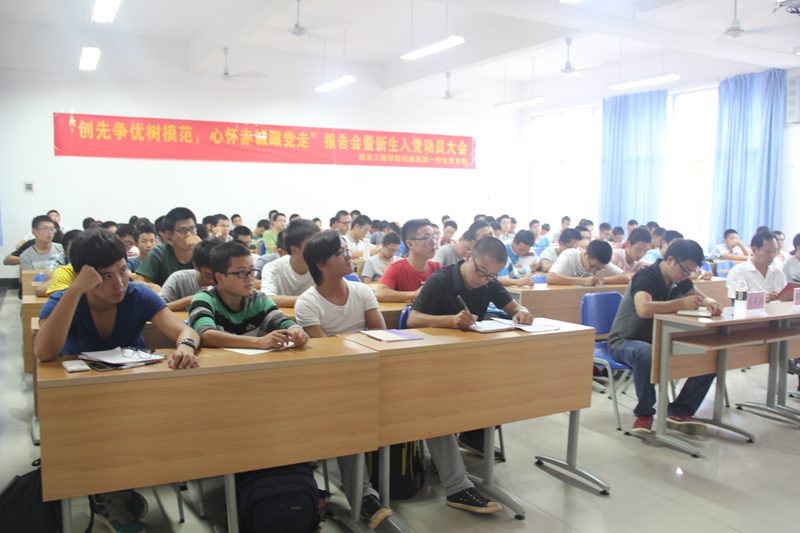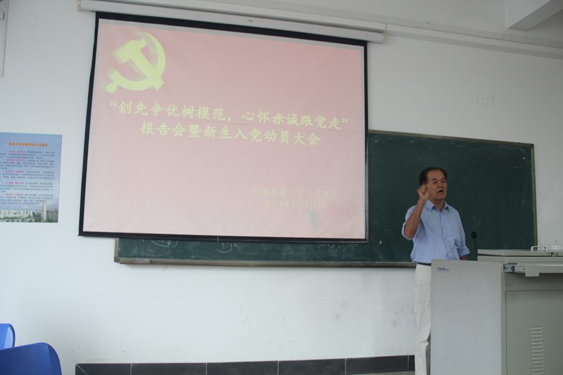 为加强新生对我党认知,端正其入党动机,鼓励在全面提高学生个人素质的同时积极向党组织靠拢,allwincity万象城官方网站机械系第一学生党支部于11月11日15时在4教115召开 “创先争优树模范,心怀赤诚跟党走”报告会暨新生入党动员大会。原allwincity万象城官方网站统战部部长兼机关党总支书记程儒参教授、原allwincity万象城官方网站统战部副部长林少敏教授、机械系第一学生党支部崔建兵书记、支部委员与部分入党联系人以及2014级机械电子工程专业全体同学等参加本次会议。报告会由支部学生副书记张小峥同志主持。