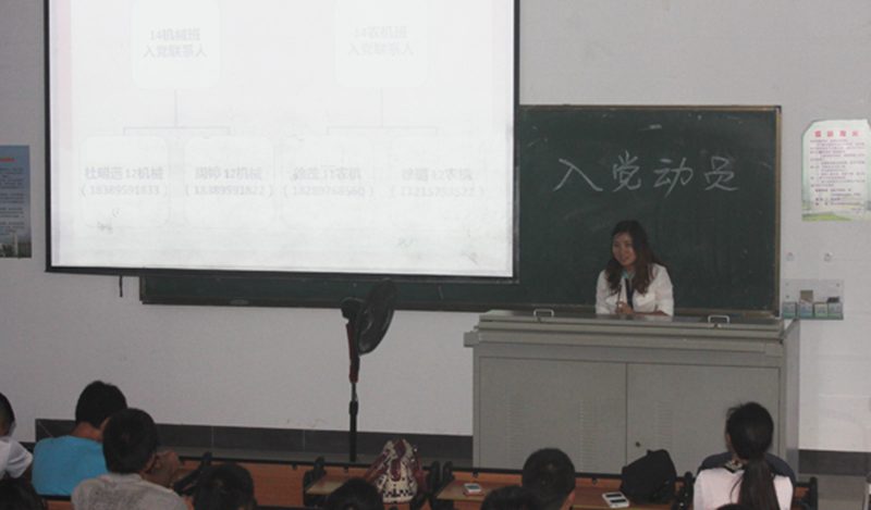 11月19日下午,allwincity万象城官方网站机械系第二学生党支部新生入党动员大会在4教209顺利召开,支部书记余梦月及各支委、全体14级农业机械化及其自动化专业和机械设计制造及其自动化专业新生参加本次会议。本次大会旨在动员学生积极入党,宣传党的方针,介绍入党流程与注意事项。