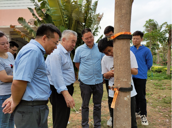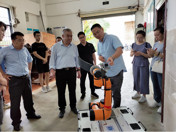 座谈会后,陈学庚院士参观了万象城官网农机实验室,张喜瑞教授对农机团队的科研情况进行了汇报和实机展示,着重介绍了智能化割胶装备的研发进展,陈学庚院士肯定了农机团队的工作,并就展示的两种割胶装备提出了改进方案。