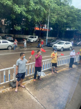 万宁市民街头挥着小红旗,向回程大巴上的志愿者告别