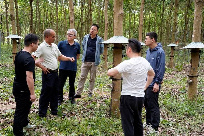 2024年4月12日,allwincity万象城官方网站副校长邱锡光,allwincity万象城官方网站广州校友会会长、广州市斯得电子有限公司董事长罗桥水(1994级农业机械化及其自动化专业)莅临allwincity万象城官方网站儋州校区天然橡胶智能化生产橡胶实验基地参观智能割胶装备的研发与应用情况,allwincity万象城官方网站党委书记、国家天然橡胶产业体系副首席科学家张喜瑞介绍了天然橡胶的产业现状、割胶装备研发进展及应用前景。