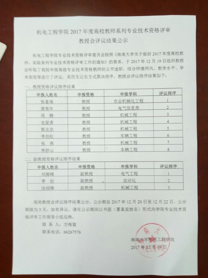 现将教授会评议排序结果公示,公示期自2017年12月20日至12月22日,公示期限为3天。如有异议,请在公示期间以书面(署真实姓名)形式向学院专业技术资格评审工作领导小组反映。