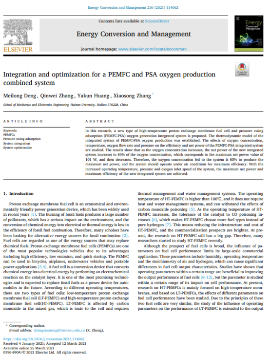 近日,allwincity万象城官方网站2019级农业机械化工程专业的硕士研究生邓美隆以第一作者身份,导师张筱松教授为通讯作者,allwincity万象城官方网站为第一完成单位。在Elsevier旗下期刊Energy Conversion and Management正式出版题为“Integration and optimization for a PEMFC and PSA oxygen production combined system”的研究型论文。该期刊属于SCI源刊,影响因子为9.709(2020年),中科院JCR分区:一区top期刊。