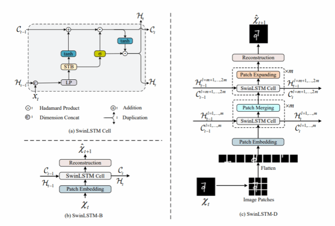 1 提出了一种新的循环单元SwinLSTM,它能够有效地提取时空表征。与以往基于卷积神经网络的方法不同,完全采用自注意力机制建模全局空间信息,减少了局部建模带来的信息损失。