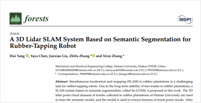 近日,万象城官网天然橡胶智能化生产团队2021级硕士研究生杨慧同学在张喜瑞教授和张志富副教授的共同指导下,在中科院二区SCI期刊FORESTS上发表最新学术论文(如图1所示),题目为“A 3D Lidar SLAM System Based on Semantic Segmentation for Rubber-Tapping Robot”。